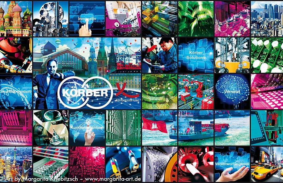 Diese Auftragsarbeit habe ich für einen Hamburger Großkonzern gestaltet. Grundlage war meine Hamburg-Collage "Faszination Hamburg" im Format 100 x 100 cm. Diese Collage hat den Auftraggeber so gut gefallen, dass wir daraus gemeinsam diese Firmen-Collage konzipiert haben. Es wurden meine Hamburg-Motive mit vier Standorten des Unternehmens und deren Geschäftsfelder kombiniert. Das Ergebnis ist eine 250 x 150 cm große personalisierte Collage in Pop Art auf Alu-Dibond. Solche Auftragsarbeiten nehme ich jederzeit gern von Privatpersonen oder Unternehmen entgegen. (Margarita Kriebitzsch)